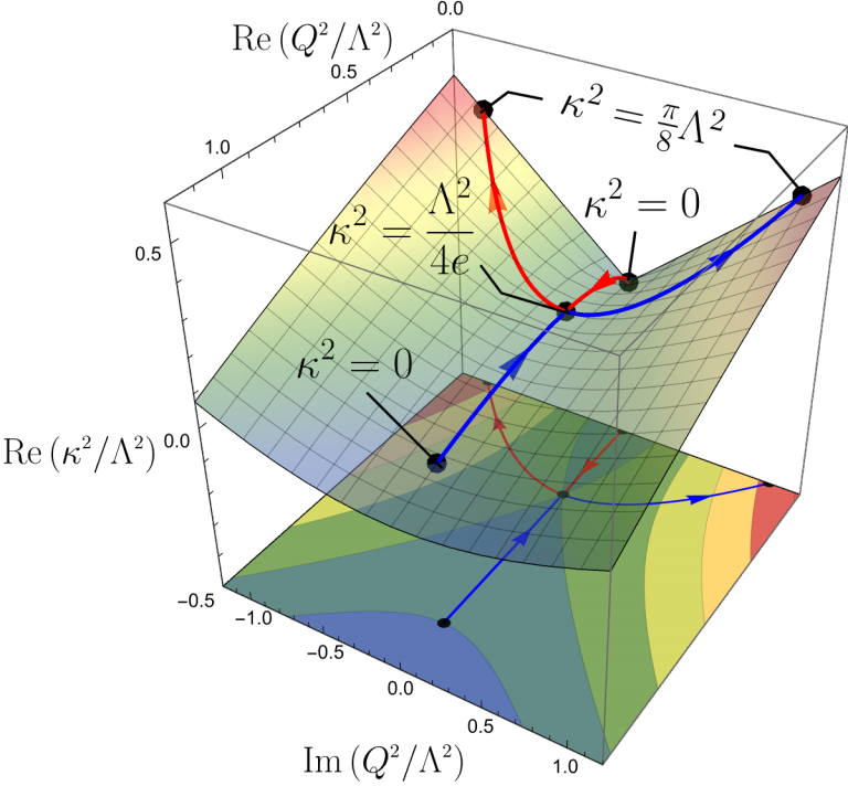 在量子场论框架下对耦合常数的定义存在一定自由度,选取g1方案将其与Bjorken和对应,则赋予QCD有效耦合常数以物理观测量的含义。Bjorken和的测量不受限于微扰论,但作为类空观测量应在全区域具有解析性。在紫外极限,微扰QCD给出耦合常数随能标变化的对数依赖行为,同时引入了具有质量量纲的参数Λ。在红外极限,借助全息光前QCD的结果,耦合常数有高斯形式能标依赖行为,具有质量量纲的模型参数κ可由强子谱确定。研究发现类空有效耦合常数的解析性对κ给出严格限制,并且在最大全纯假定下κ由Λ唯一确定。如下图所示,这一理论结果不仅有效规避了非物理的朗道极点,并且在非微扰能区至几个GeV的微扰能区都能很好地描述实验数据。