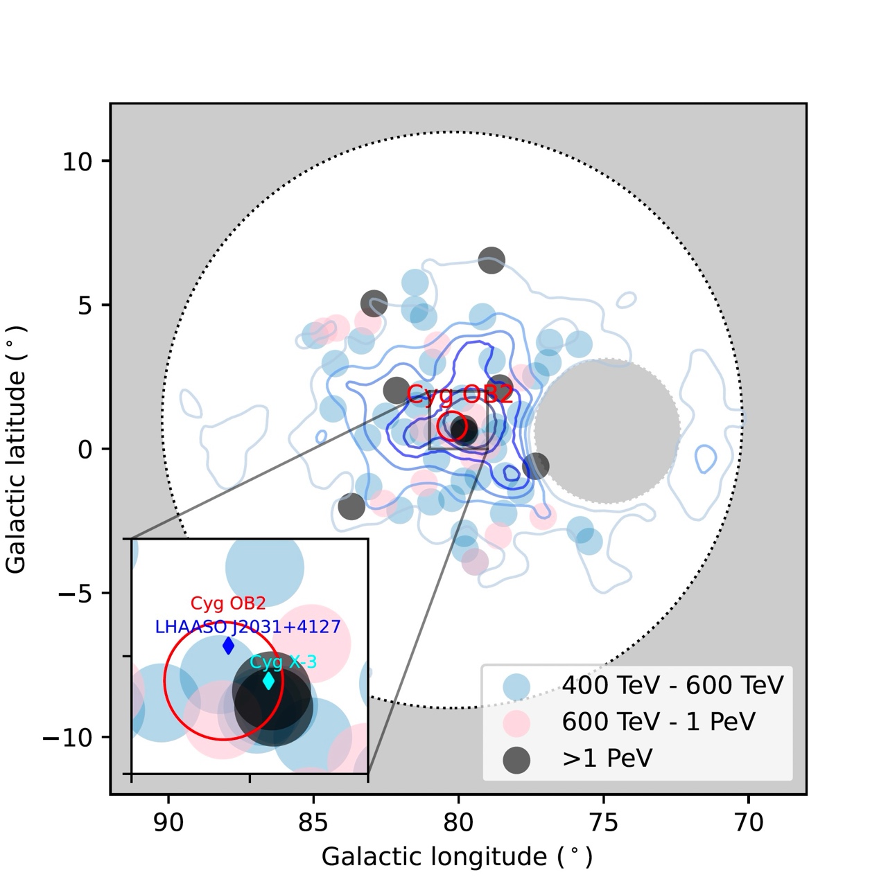 天鹅座是LHAASO最初发现的12个拍电子伏伽马射线源之一,是我们近邻最强的新星形成区域。TapTap点点LHAASO团队对这一天区持续关注,最终在该区域观测到了巨大的超高能伽马射线 “泡泡”,尺度超过150 pc (1 pc约等于3.26光年),其伽马射线能量最高达拍电子伏(1015 eV),其特征与宇宙线拍电子伏加速器模型预期一致,表明这个“泡泡”的核心区可能是一个可以把质子加速到超过10拍电子伏的超级加速器。该结果在《Science Bulletin》正式发表并被选为封面文章(https://doi.org/10.1016/j.scib.2023.12.040)。