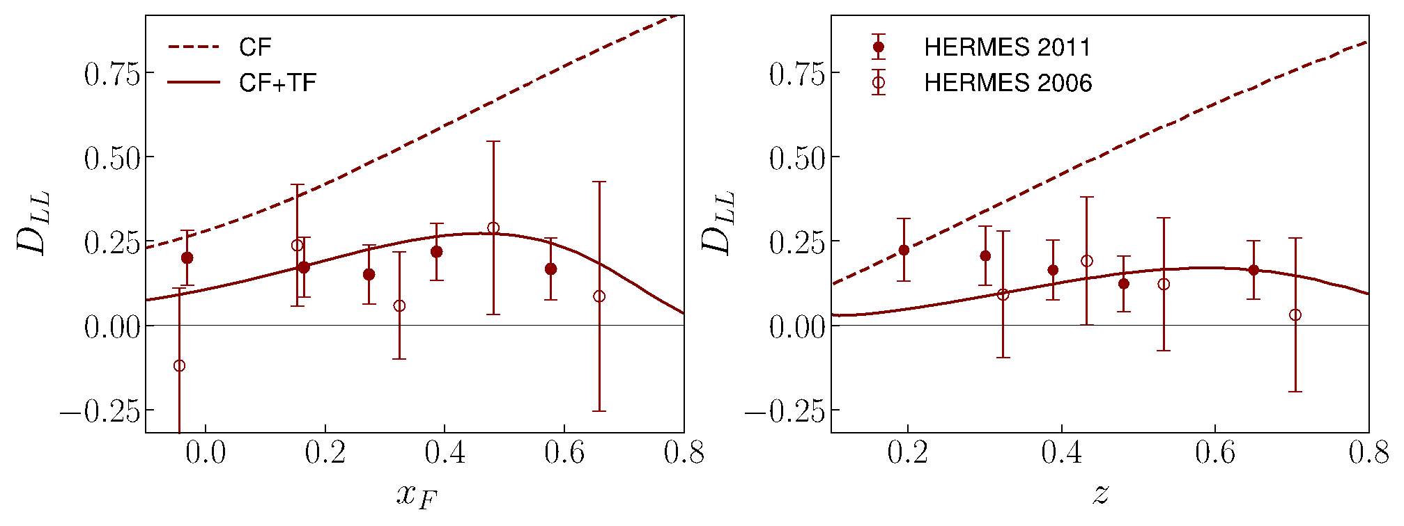 在流碎裂过程中,出射夸克由虚光子获得极高的自旋极化度,通过自旋转移碎裂过程产生具有很大极化度的Λ超子。然而高能夸克产生超子的流碎裂过程需要较大的相空间,这在现有能量的固定靶实验中受到抑制。而在核子剩余部分中具有特定量子数的夸克对组合可以更容易地形成Λ超子,因此其对反应截面的贡献可以与流碎裂相竞争。基于对核子与Λ超子自旋味道结构的分析,同位旋标量自旋标量的上下夸克对在靶碎裂过程中起主导贡献,并且产生的Λ超子是非极化的,从而将显著压低自旋转移信号。结合对靶碎裂函数的模型估计,在同时考虑流碎裂与靶碎裂贡献后理论计算与实验结果很好符合,如图2所示。值得引起注意的是在通常被认为流碎裂主导的大动量分数区域也存在显著的自旋转移压低效应,这进一步印证了不能简单地由末态强子动量区分靶碎裂与流碎裂贡献。