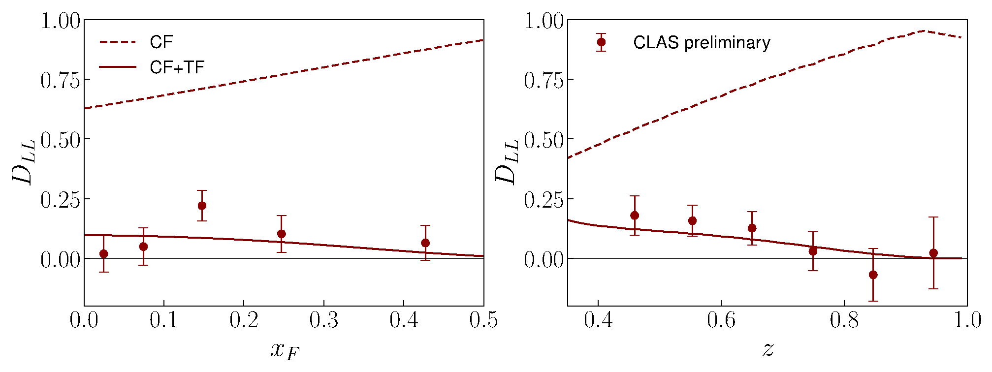 3: 靶碎裂机制导致自旋转移压低效应与CLAS实验数据比较。