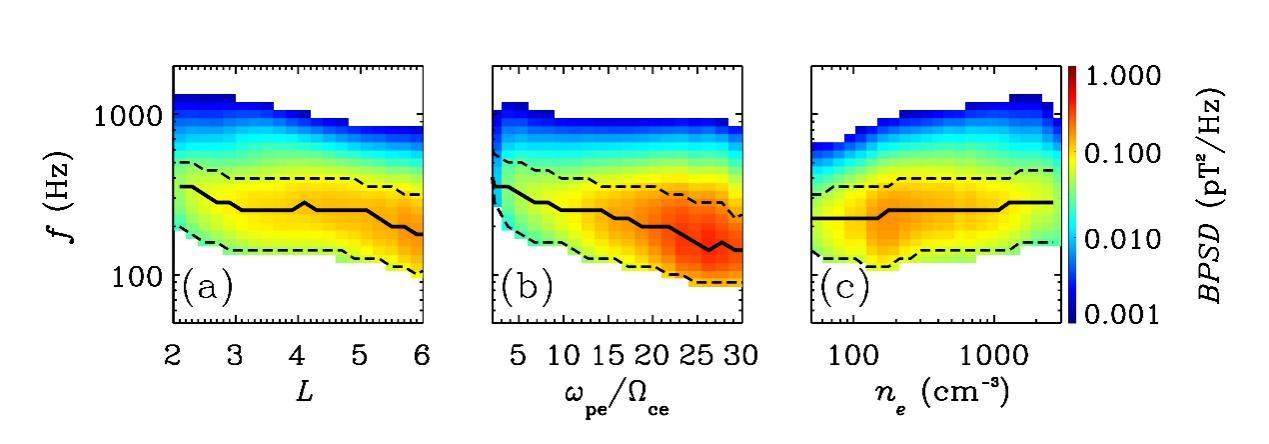 2:嘶声波中值磁场功率谱密度随(aL值(bωpece 及(cne的统计分布