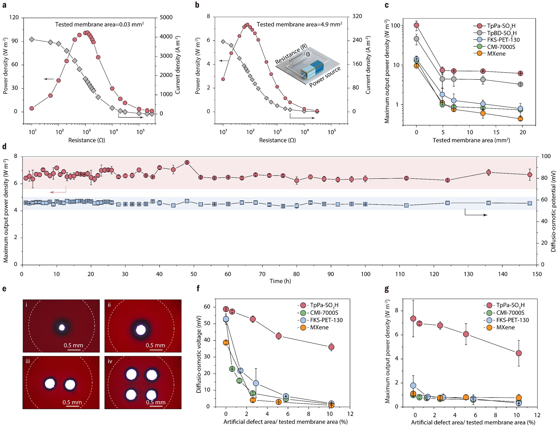不同于反向电渗析技术面临的上述制约因素,研究团队提出了基于扩散—渗透的新机制用于盐差能收集,即双电层内界面渗透压的梯度分布将驱动扩散—渗透流,其携带的净电荷将形成电流,该作用机制无需依赖膜材料的离子选择性。在0.03 mm2的小测试面积下实现了101.2 W m-2的超高功率密度,在20 mm2的大测试面积下仍具备7 W m-2的高功率密度;更为重要的是,该体系表现出显著的抗缺陷能力,在引入超过测试面积10%的孔型缺陷后仍能维持稳定的输出电压与功率,而反向电渗析机制在相近缺陷条件下几乎失效。这为低成本、可规模化的盐差发电提供了新的研究思路。