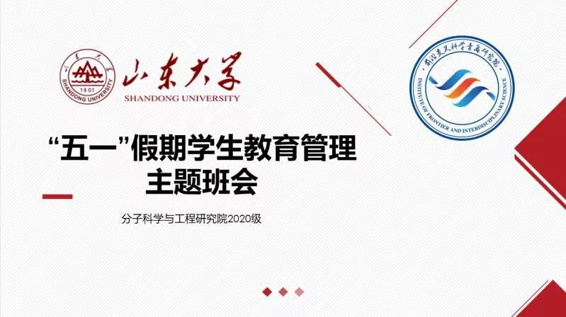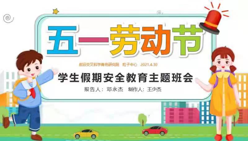 “五一”国际劳动节将至,为切实保障广大学生生命健康及人身财产安全,帮助学生度过一个平安欢乐的假期,前沿交叉科学青岛研究院于4月29日至30日开展了“五一”假期学生教育管理主题班会,会议由各班班长主持,采用线上与线下相结合的方式进行。