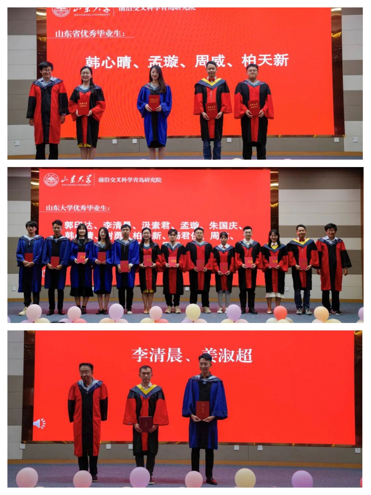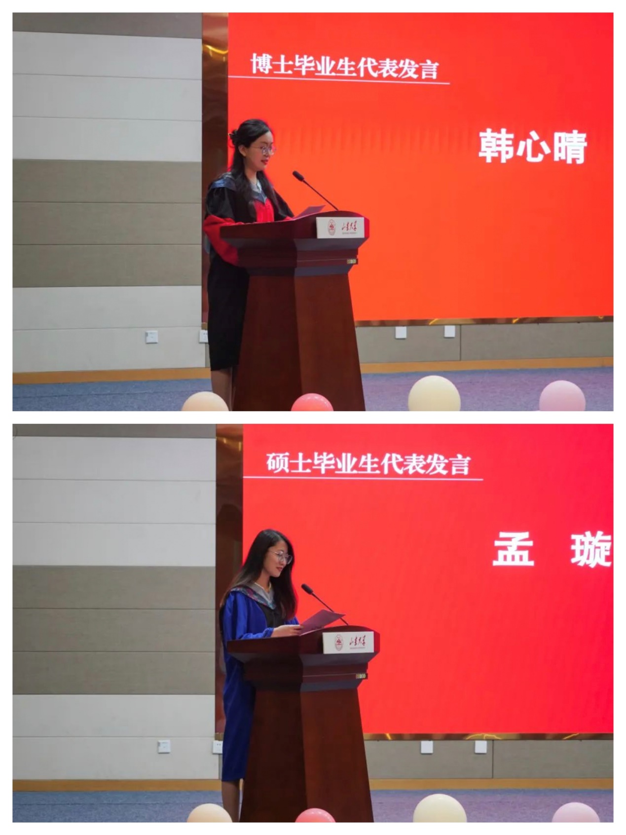 博士毕业生代表韩心晴、硕士毕业生代表孟璇在发言中回顾了求学期间的成长与收获,表达了对母校、研究院和老师们的衷心感谢,并表示在接下来的日子里,无论身处何处,都会与山大共同成长,将时刻秉持“为天下储人才、为国家求富强”的责任担当,不忘“学无止境、气有浩然”的校训教诲,秉承山大精神,弘扬山大文化,不断向科技难题发起冲锋,为国家做出应有的贡献。