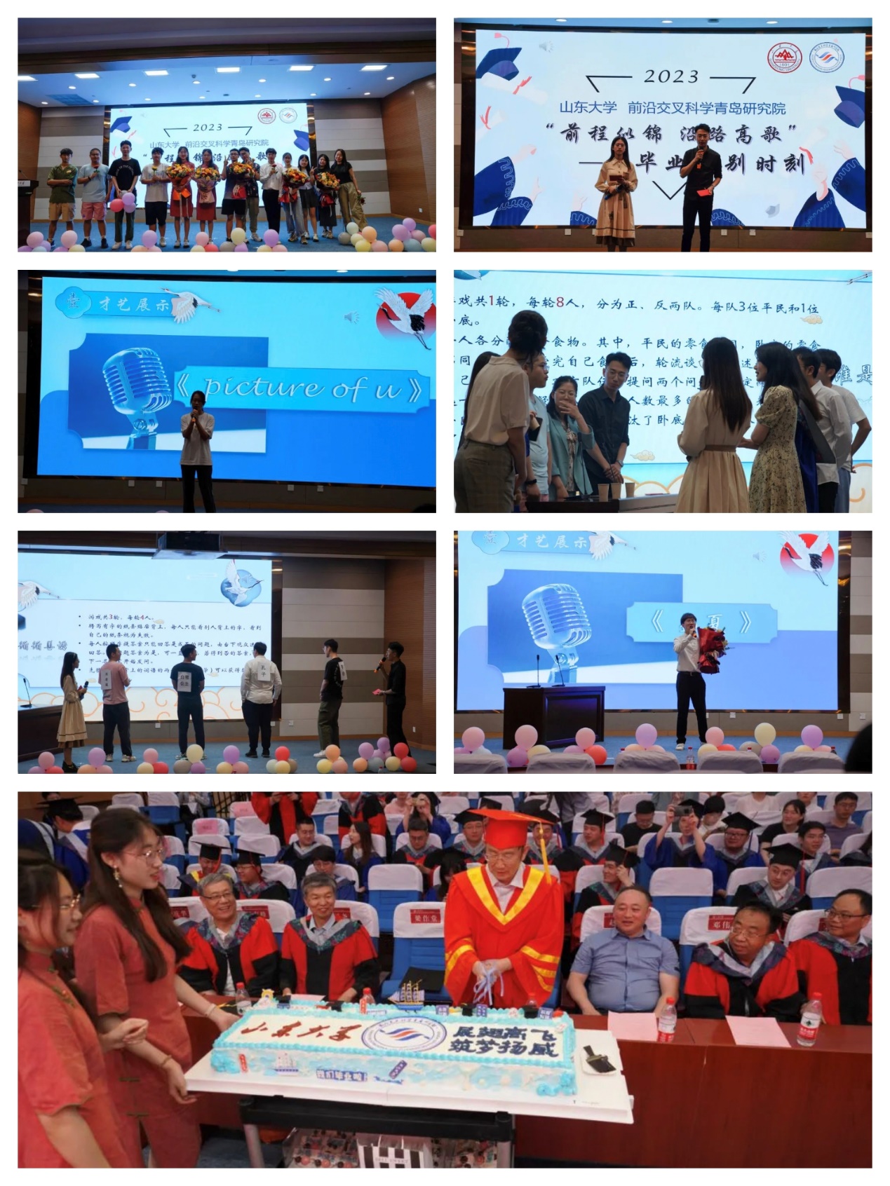 典礼后,研究院还举办了“前途似锦,沿路如歌”毕业生告别晚会。韩圣浩校长为毕业生们切下象征方正中直,贯通乾坤的一刀。希望每位毕业同学都能时刻秉持自强不息的奋斗精神和厚德载物的品性追求,带着TapTap点点、前沿交叉科学青岛研究院的祝福与嘱托,扬帆远航!