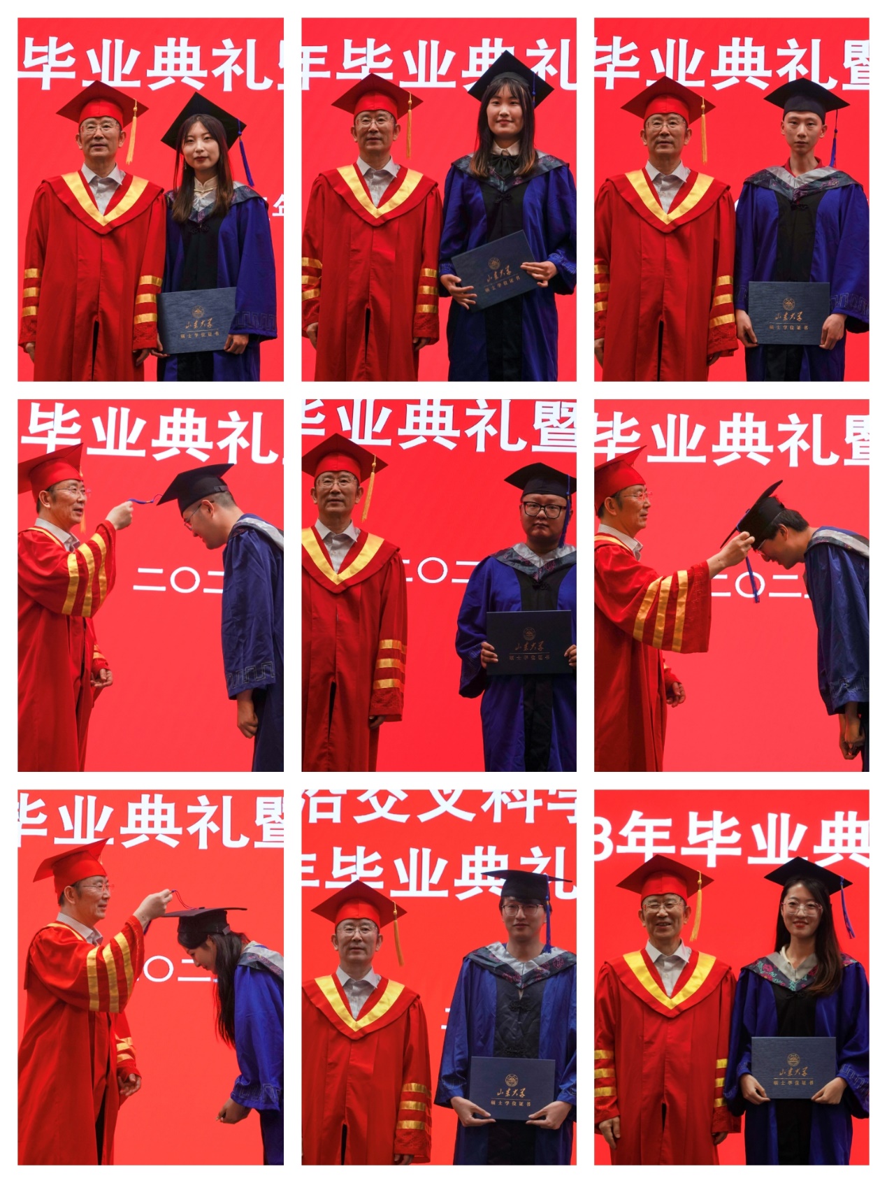 在学位授予仪式环节,韩圣浩为每位毕业生拔穗颁发学位证书并合影留念。在悠扬的旋律中,前沿交叉科学青岛研究院2023年学生毕业典礼暨学位授予仪式圆满完成。