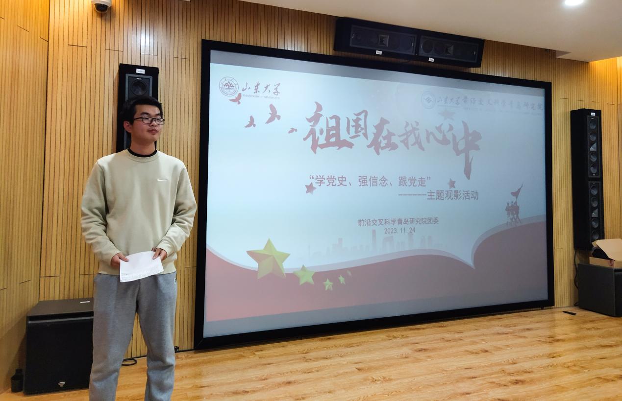 为深入贯彻学习党的二十大精神,强化理想信念,立足科研报国,11月24日晚,前沿交叉科学青岛研究院研究生会在图书馆12层观影厅开展“学党史、强信念、跟党走”主题观影活动。