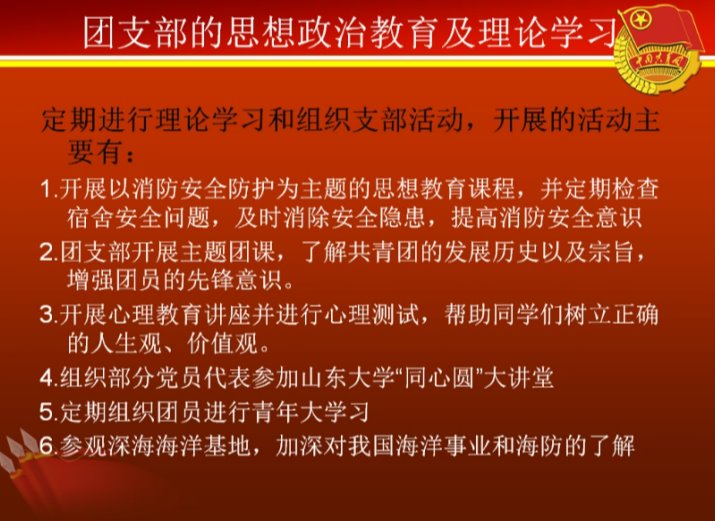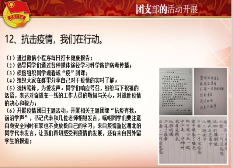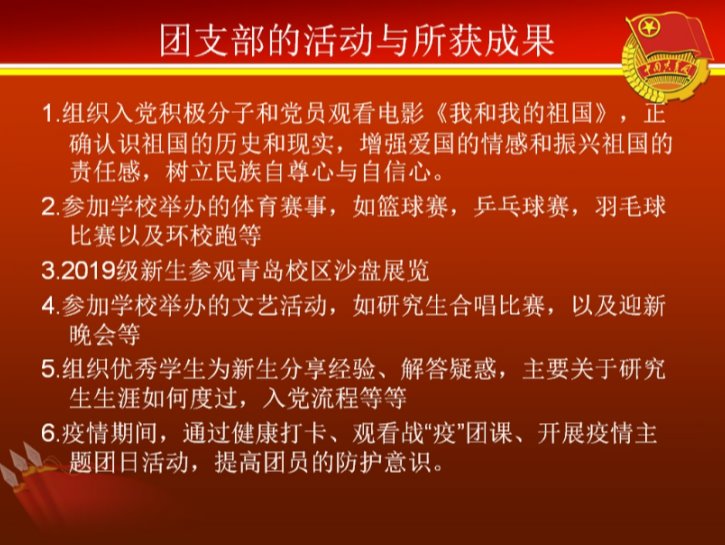 随后,各基层团支部团支书进行答辩,本次答辩采用PPT和语音结合的方式。分子团支书王艺颖和粒子团支书张晴分别介绍了自己的团支部组成,汇报了团支部的思想政治教育及理论学习情况、团支部工作制度及学生工作、团支部建设的未来规划,并且展示了各自团支部的活动与所获成果,充分显示出研究院蓬勃向上的精神面貌。值得一提的是,各团支部在疫情防控工作中都充分发挥了基层团组织的作用,深入了解了同学们居家的学习生活情况,增强了团支部的凝聚力。