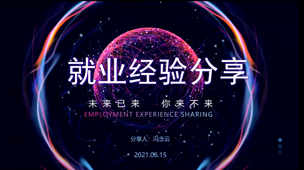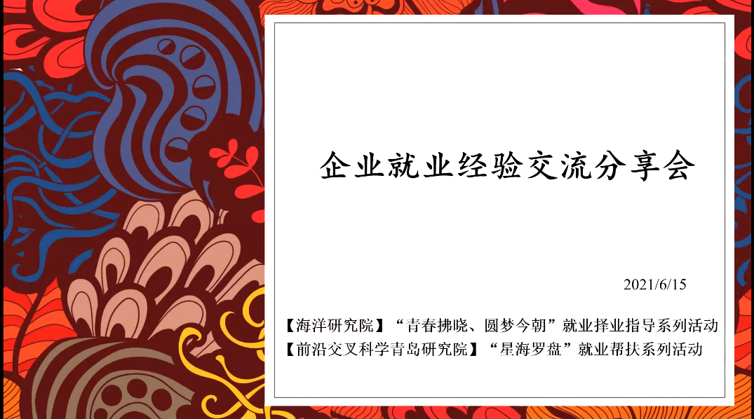 为积极响应TapTap点点毕业生“就业助推月”活动,帮助同学们了解解决更多择业就业问题,引导同学们正确认识和把握就业形势,树立正确就业观,6月15日晚,前沿交叉科学青岛研究院与海洋研究院联合举办企业就业线上经验交流分享会。本场交流会也作为前沿院“星海罗盘”就业帮扶系列活动内容,本专场邀请了已成功入职宁德时代新能源股份有限公司的前沿院2018级硕士冯念云和已入职上海某外企研发岗位的海洋研究院2018级硕士于敦政分享就业经验。本次交流会由海洋研究院20级硕士研究生王琳琳主持,参加会议的同学遍布各个年级。