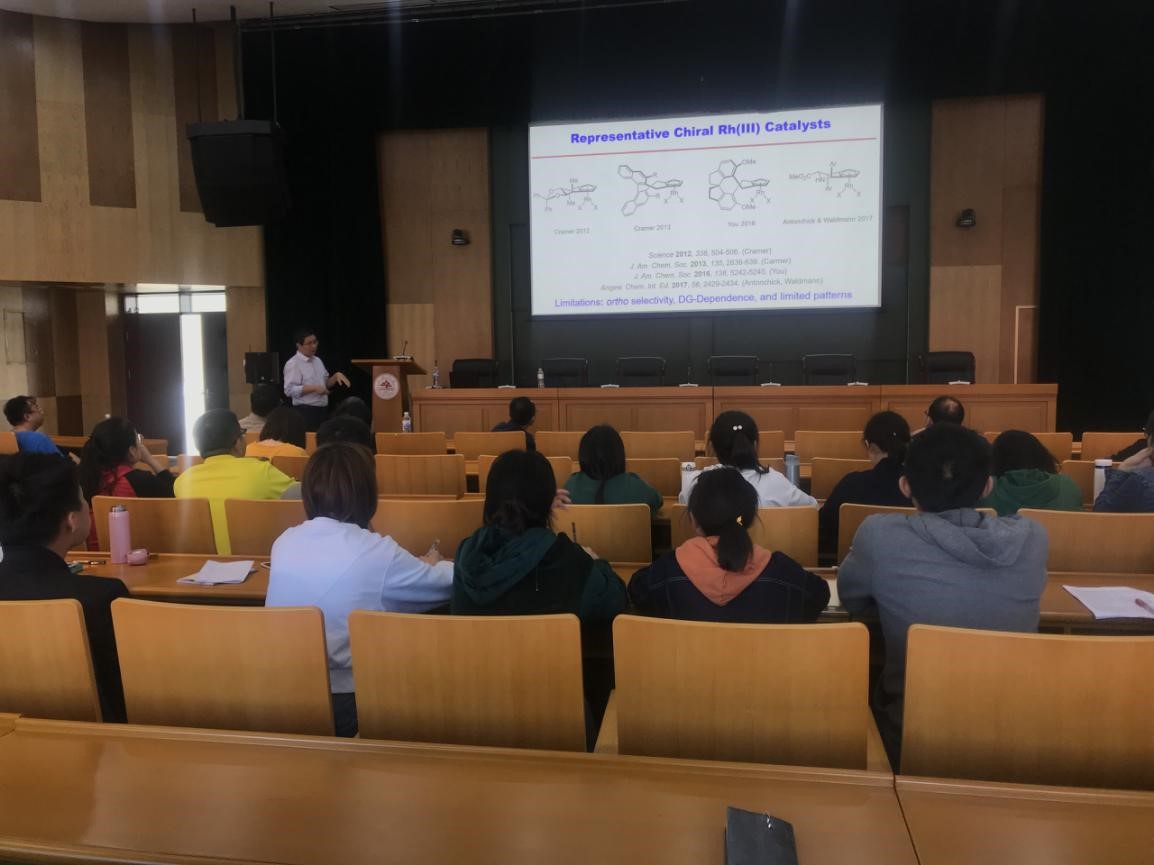 李兴伟教授向与会师生介绍了其研究团队近五年内取得的进展,尤其是不对称催化领域的系列进展。报告中李兴伟教授指出高价态金属络合物在碳氢键活化领域有广泛的应用,由于该类金属形成的M-C键极化程度大,因此与不饱和或者极性分子有较强的相互作用,同时也有利于金属-定位基之间的强协同作用。这些相互作用既有利于反应活性的提高,也有利于实现芳烃定位基的多功能化。李兴伟教授及其团队围绕底物活化策略,实现了碳氢键活化与官能化反应类型的多样性以及和有机化学其它研究领域的交叉融合(如张力环化学、高价碘、环加成、氢转移、氧转移等)。尤其是通过对通底物、催化剂、添加剂、反应条件的调控实现了反应中化学、立体、区域选择性的有效控制。论坛期间,李兴伟教授回答了与会老师与同学的提问,鼓励研究生多掌握知识和技能并培养科研兴趣。最后以自己及其团队的科研经历对今后研究生的科研工作提出了宝贵的建议。