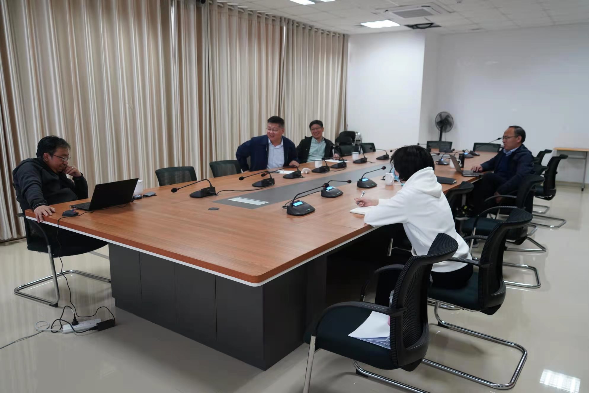 首先,王衍章处长介绍,此次王振光主任前来前沿交叉科学青岛研究院做客,主要目的是为了更好地加强校内合作交流,寻求交叉融合创新的科研合作突破点。王振光表示出对研究院面向前沿科学研究领域的兴趣和想加深了解的需求。随后,黄性涛围绕粒子物理超大数据处理研究领域进行介绍,邓伟侨围绕研究院基本情况、特色优势,以及涉及的前沿科学研究领域进行了介绍,对包括核酸快速检测、快速药物研发、小分子传感器、荧光探针的应用在内的生物医药领域研究方向进行了详细阐述。同时,王振光结合医学部临床研究实际情况与需求,与两位院长就若干研究内容进行深入交流讨论,寻找进一步可行的交叉融合、创新合作的切入点。通过广泛、深入的研讨交流,双方成功建立了几个重点研究方向的初步合作意向。
