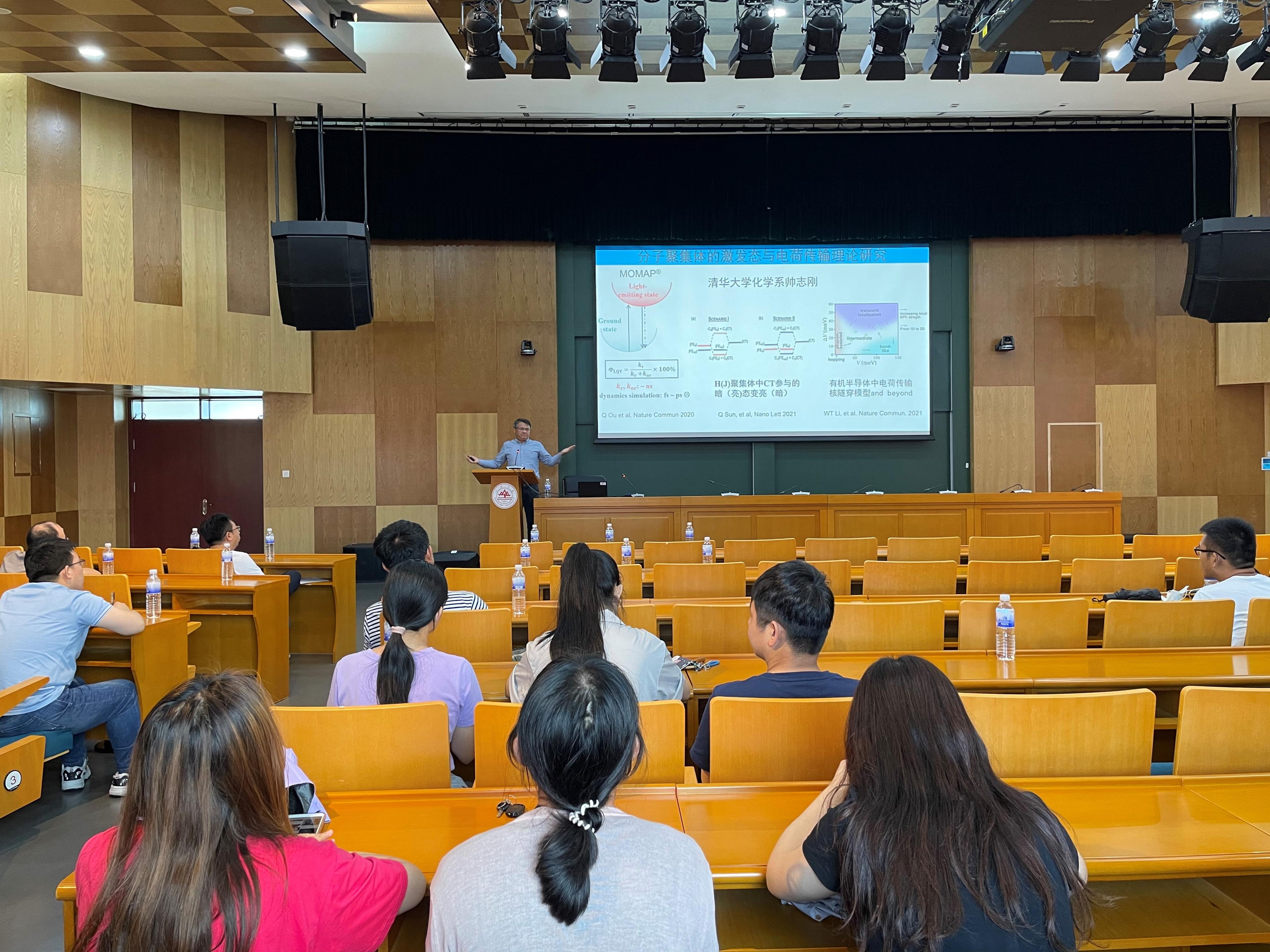 帅志刚教授的报告主要介绍了三个方面的内容:分别为分子发光效率的理论方法发展—MOMAP的理论基础;H-聚集体中电荷转移态会导致暗态变亮以及有机/碳材料的电荷传输理论的普适图像。报告结束后,邓伟侨教授对帅志刚教授的学术报告作了总结,随后参加讲座的师生们针对分子发光效率以及电荷传输等相关问题与帅志刚教授进行了交流讨论,帅志刚教授对大家的问题一一进行了解答。