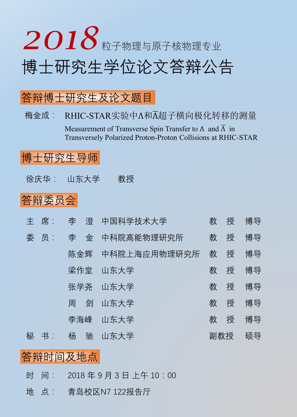 【18-09-03】梅金成博士研究生学位论文答辩公告