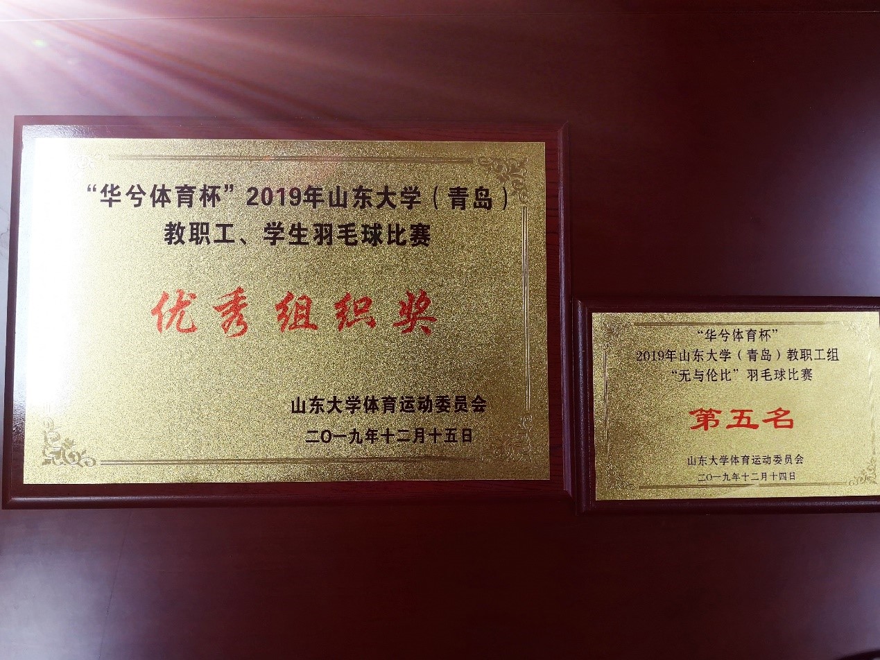 比赛期间,参赛师生队员们发扬团结协作精神,合理分工,密切配合,充分展示了研究院师生良好的精神面貌和羽毛球竞技水平。队员们奋力拼搏的精神获得了大家的高度赞扬,在寒冷的冬日,羽毛球馆内洋溢着欢呼声和喝彩声。经过激烈角逐,我院教师组代表队在16支教职工参赛队伍中脱颖而出,荣获第五名并获得“优秀组织奖”。学生组经过激烈的角逐,孔凡刚同学获男子单打第五名的佳绩,赵静和孙泽浩同学获得男女混合双打第三名的佳绩,前沿交叉科学青岛研究院获团体第六名的好成绩。